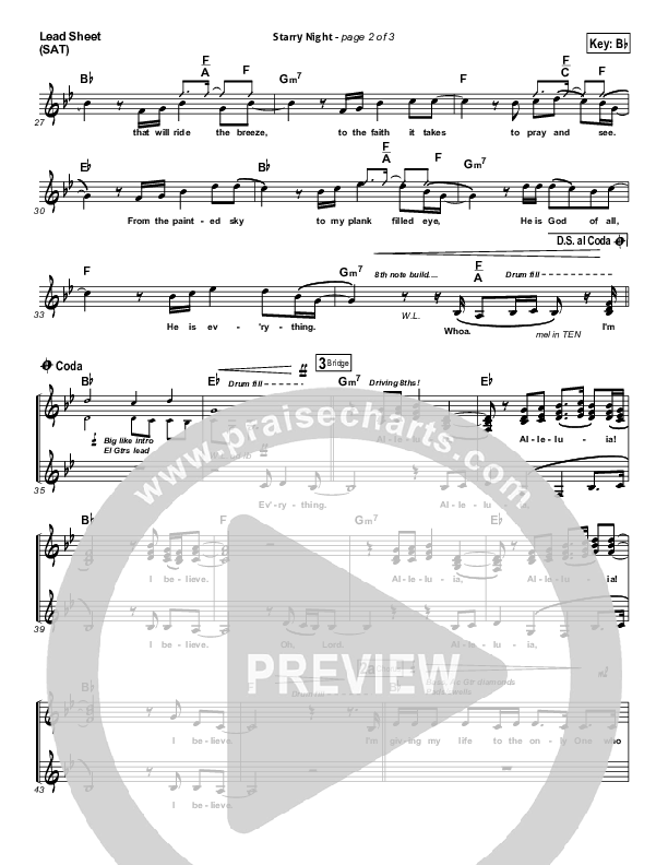Download the sheet music for Starry Night by Chris August, from the album No Far Away. This song was arranged by Joel Mott / Brad Henderson in the key of Bb, C.