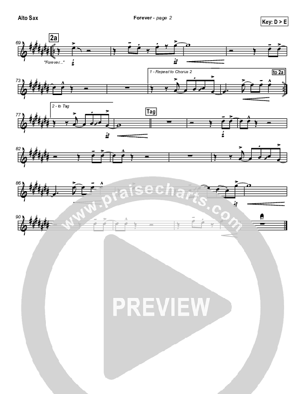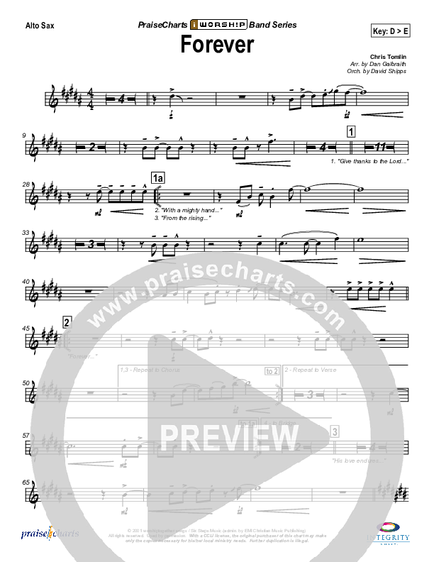 Download the AltoSax sheet music for Forever by Chris Tomlin, from the album iWorship: DVD D. This song was arranged by Daniel Galbraith / David Shipps in the key of D, F.