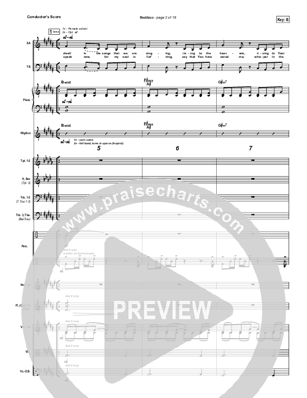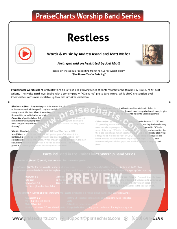 Download the Orchestration for Restless by Audrey Assad, from the album The House You're Building. This song was arranged by Joel Mott in the key of B, Bb.