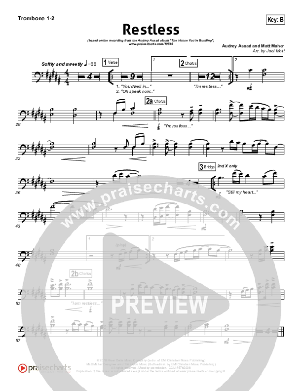 Download the Trombone 1,2 sheet music for Restless by Audrey Assad, from the album The House You're Building. This song was arranged by Joel Mott in the key of B, Bb.