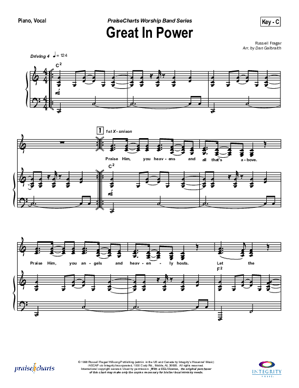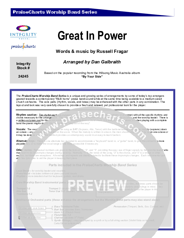 Download the Orchestration for Great In Power by Hillsong Worship, from the album By Your Side. This song was arranged by Daniel Galbraith in the key of C, D.