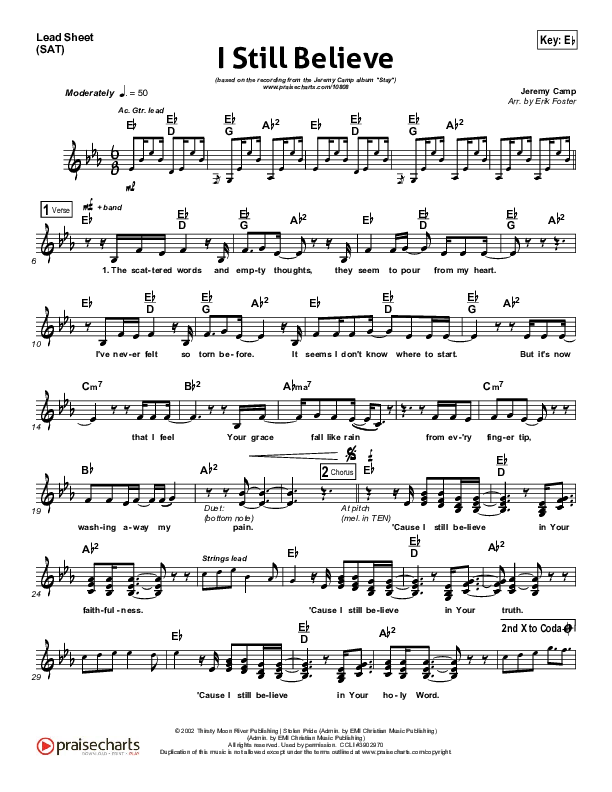 Download the sheet music for I Still Believe by Jeremy Camp, from the album The Best Of WOW 2004. This song was arranged by Erik Foster in the key of D, Eb.
