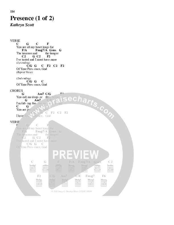 Download the PDF Chord Charts for Presence by Kathryn Scott, from the album We Still Believe . This song was arranged by Integrity Music in the key of C.