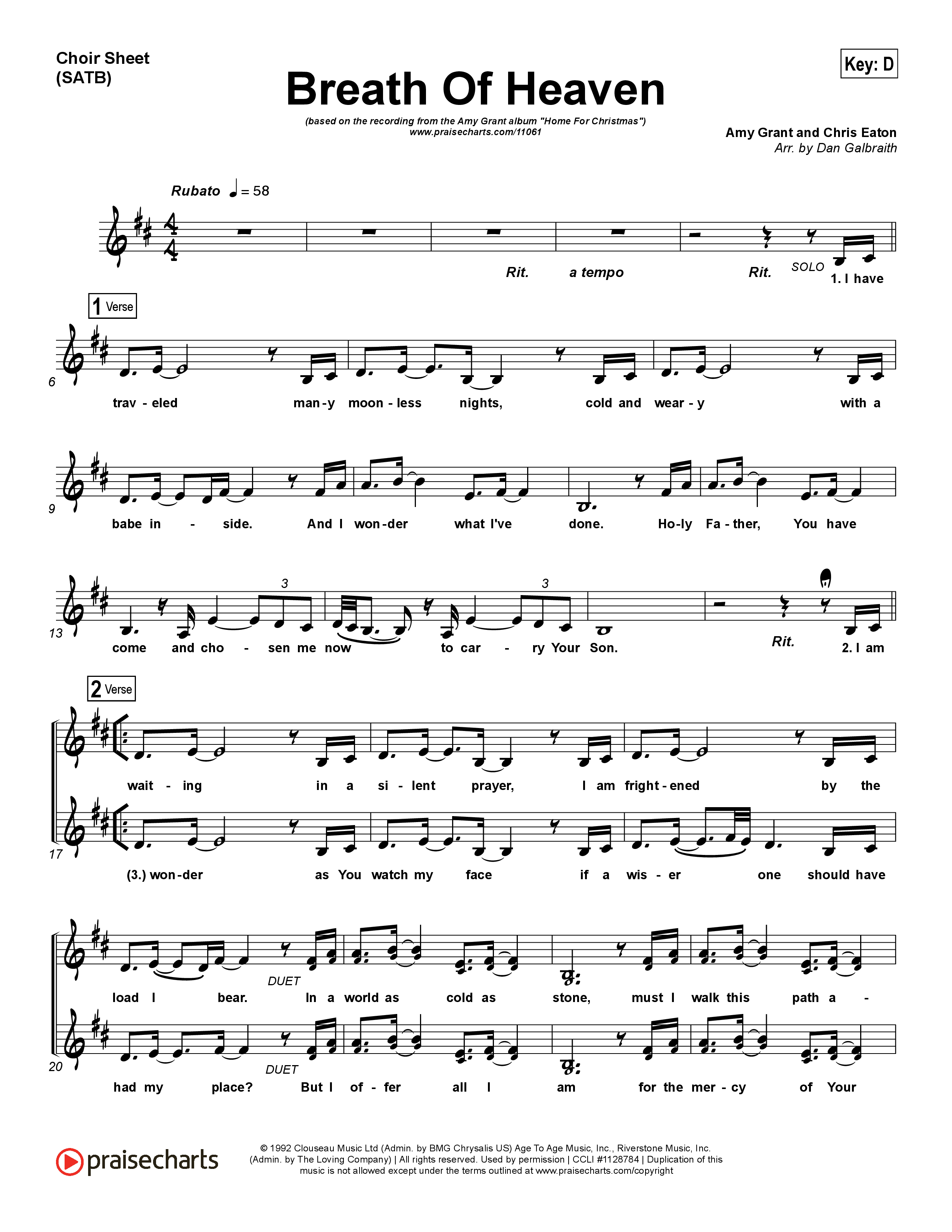 Download the Choir Sheet for Breath Of Heaven (Mary's Song) by Amy Grant, from the album Home For Christmas. This song was arranged by Daniel Galbraith in the key of D, Eb.