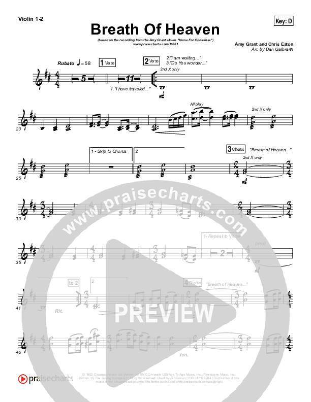 Download the Orchestration string parts for Breath Of Heaven (Mary's Song) by Amy Grant, from the album Home For Christmas. This song was arranged by Daniel Galbraith in the key of D, Eb.