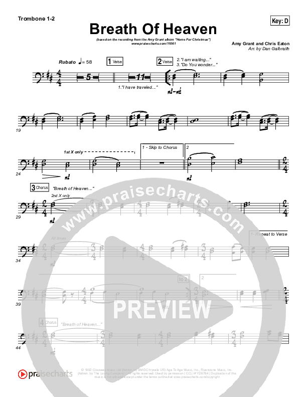 Download the Trombone 1,2 sheet music for Breath Of Heaven (Mary's Song) by Amy Grant, from the album Home For Christmas. This song was arranged by Daniel Galbraith in the key of D, Eb.