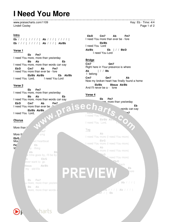 Download the PDF Chord Charts for I Need You More by Lindell Cooley, from the album Revival At Brownsville. This song was arranged by Mark Cole in the key of E, Eb.