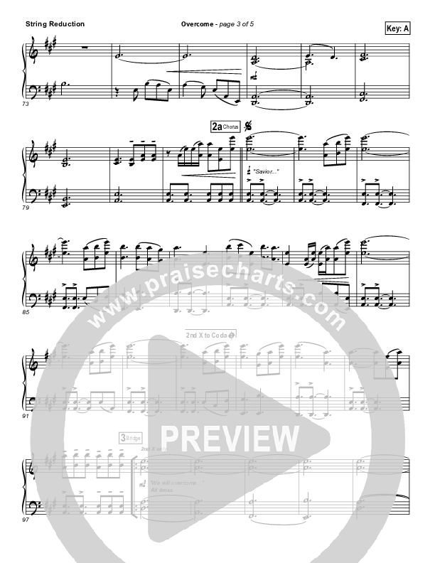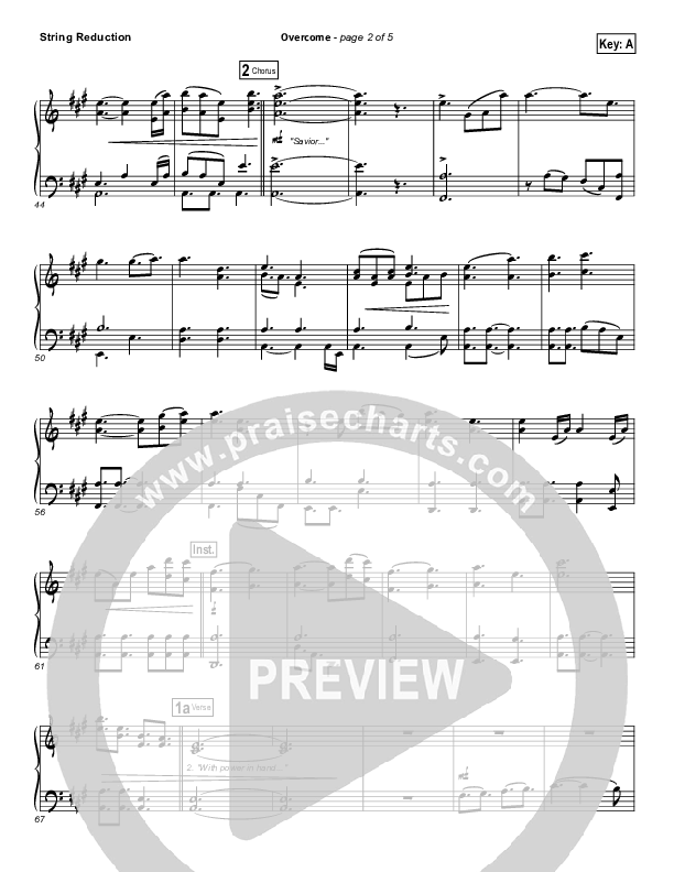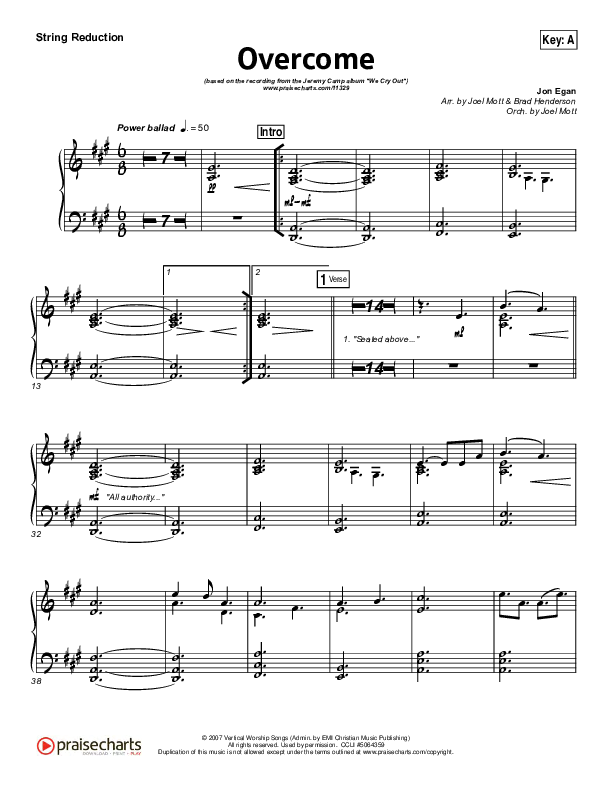 Download the Orchestration string parts for Overcome by Jeremy Camp, from the album We Cry Out: The Worship Project. This song was arranged by Joel Mott / Brad Henderson in the key of A, G.