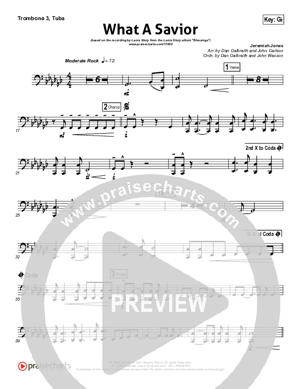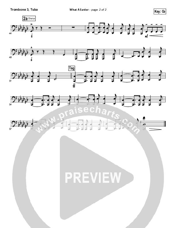 Download the Trombone 3/Tuba sheet music for What A Savior by Laura Story, from the album iWorship: DVD T. This song was arranged by Daniel Galbraith / John Carlson in the key of G, Gb.