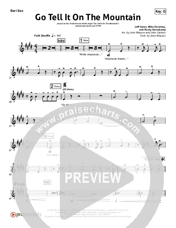 Download the Bari Sax sheet music for Go Tell It On The Mountain by Tenth Avenue North, from the album Go Tell It On The Mountain. This song was arranged by John Wasson / John Carlson in the key of F, G.