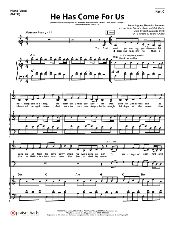 Download the sheet music for He Has Come For Us (God Rest Ye Merry Gentlemen) by Meredith Andrews, from the album He Has Come For Us (God Rest Ye Merry Gentlemen). This song was arranged by Keith Everette Smith / Erik Foster in the key of C, D.
