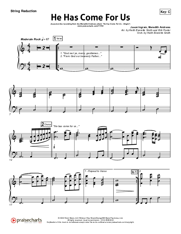 Download the Orchestration for He Has Come For Us (God Rest Ye Merry Gentlemen) by Meredith Andrews, from the album He Has Come For Us (God Rest Ye Merry Gentlemen). This song was arranged by Keith Everette Smith / Erik Foster in the key of C, D.