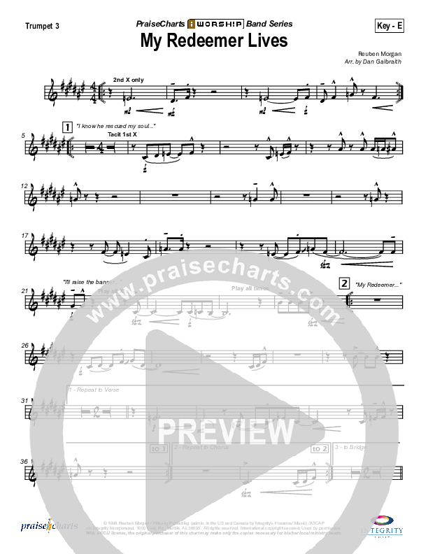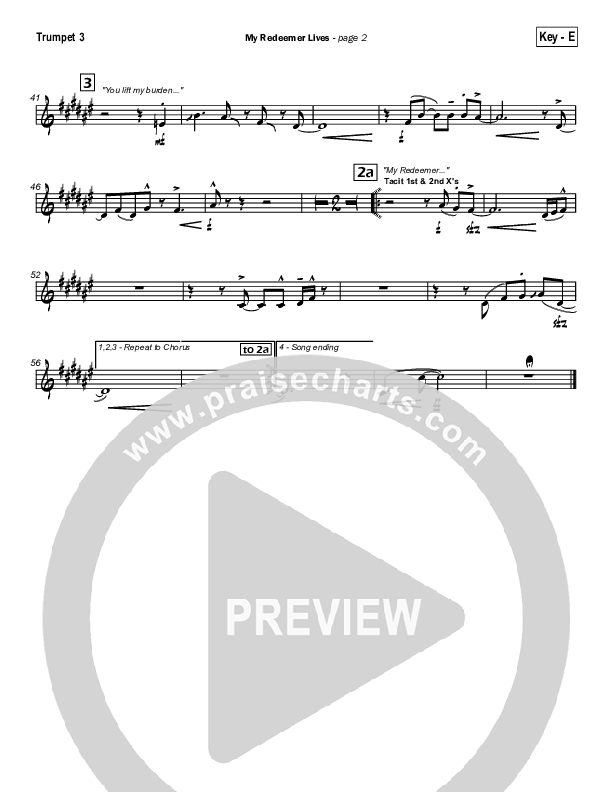 Download the Trumpet 3 sheet music for My Redeemer Lives by Hillsong Worship, from the album By Your Side. This song was arranged by Daniel Galbraith in the key of E, F.