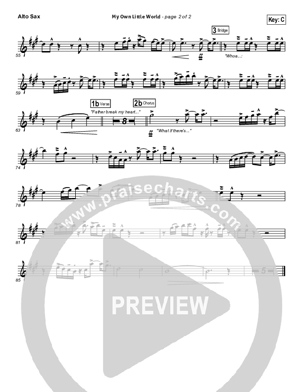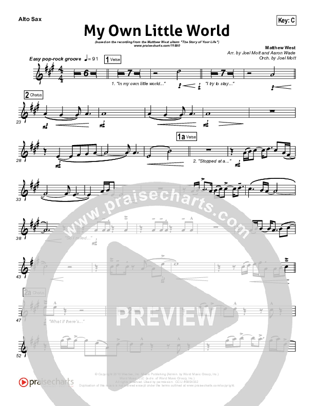 Download the AltoSax sheet music for My Own Little World by Matthew West, from the album The Story Of Your Life. This song was arranged by Joel Mott / Aaron Wade in the key of C, Db.
