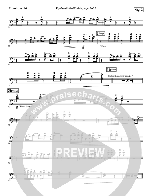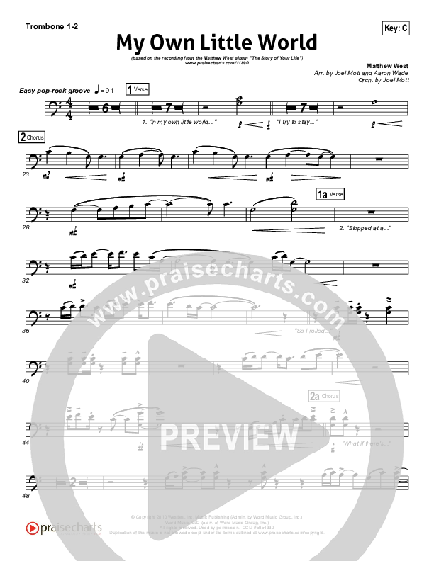 Download the Trombone 1,2 sheet music for My Own Little World by Matthew West, from the album The Story Of Your Life. This song was arranged by Joel Mott / Aaron Wade in the key of C, Db.