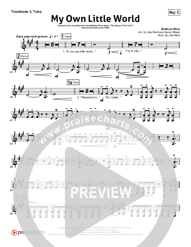 Download the Trombone 3/Tuba sheet music for My Own Little World by Matthew West, from the album The Story Of Your Life. This song was arranged by Joel Mott / Aaron Wade in the key of C, Db.