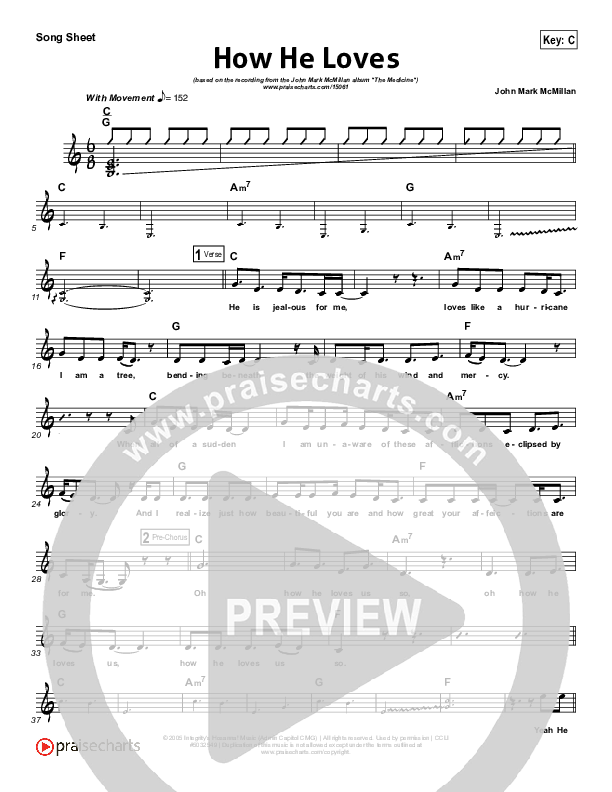 Download the sheet music for How He Loves by John Mark McMillan, from the album The Medicine. This song was arranged by Integrity Music in the key of C.