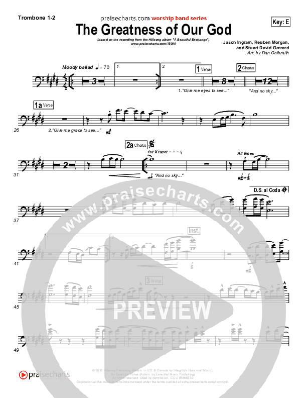 Download the Trombone 1,2 sheet music for The Greatness Of Our God by Hillsong Worship, from the album A Beautiful Exchange. This song was arranged by Daniel Galbraith in the key of E, F.