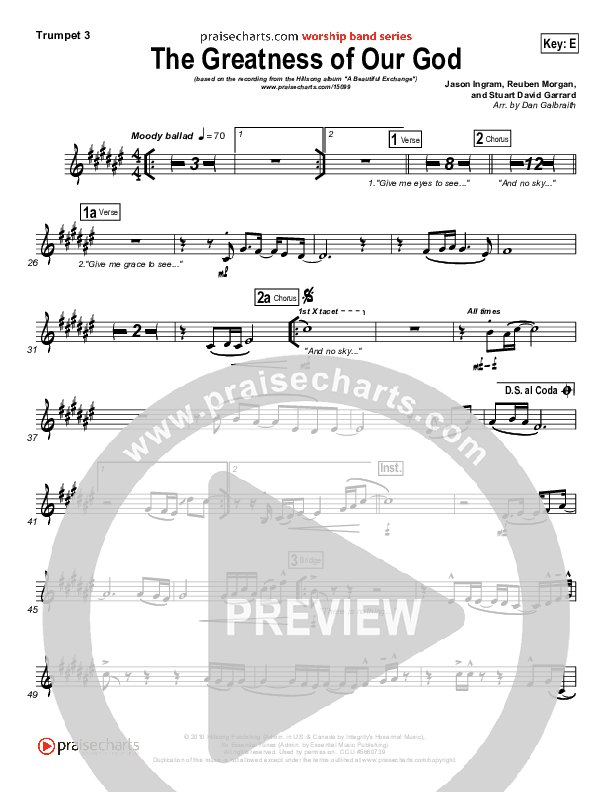 Download the Trumpet 3 sheet music for The Greatness Of Our God by Hillsong Worship, from the album A Beautiful Exchange. This song was arranged by Daniel Galbraith in the key of E, F.