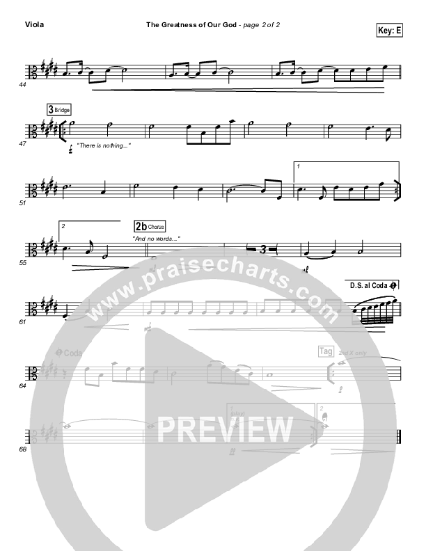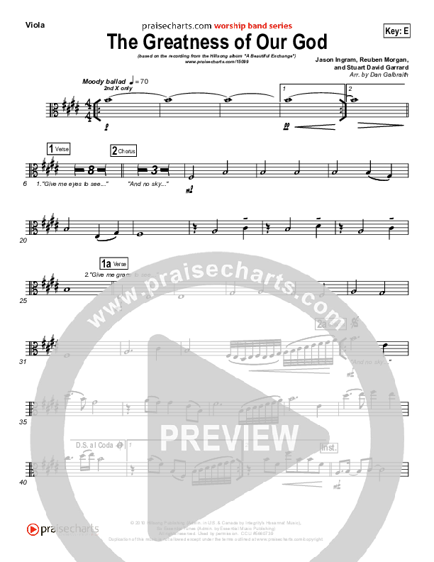 Download the Viola sheet music for The Greatness Of Our God by Hillsong Worship, from the album A Beautiful Exchange. This song was arranged by Daniel Galbraith in the key of E, F.