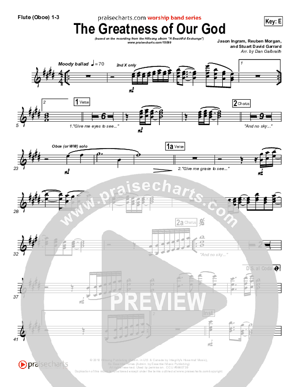Download the Orchestration wind parts for The Greatness Of Our God by Hillsong Worship, from the album A Beautiful Exchange. This song was arranged by Daniel Galbraith in the key of E, F.