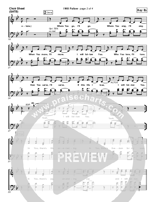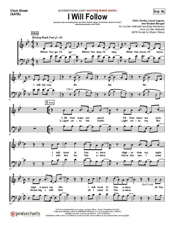 Download the Choir Sheet for I Will Follow by Chris Tomlin, from the album I Will Follow - Single. This song was arranged by Daniel Galbraith / Brad Henderson in the key of A, Bb, G.