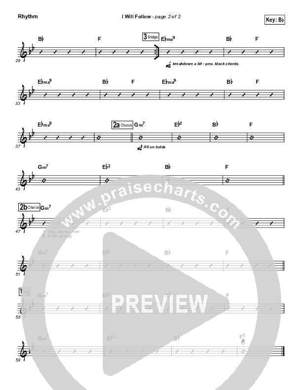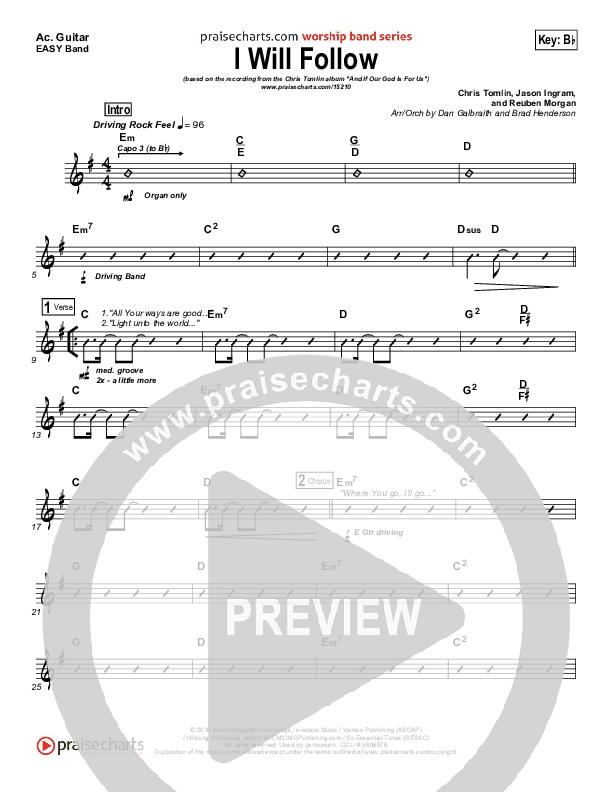 Download the Rhythm Chart for I Will Follow by Chris Tomlin, from the album I Will Follow - Single. This song was arranged by Daniel Galbraith / Brad Henderson in the key of A, Bb, G.