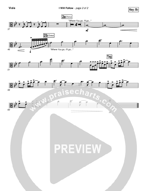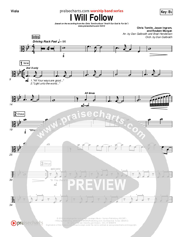 Download the Viola sheet music for I Will Follow by Chris Tomlin, from the album I Will Follow - Single. This song was arranged by Daniel Galbraith / Brad Henderson in the key of A, Bb, G.