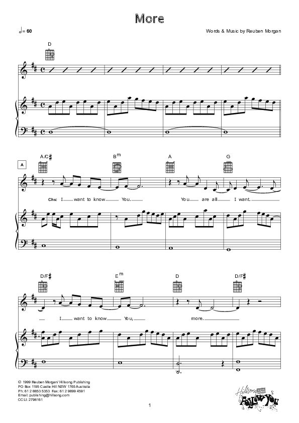 Download the sheet music for More by Hillsong Kids, from the album Follow You. This song was arranged by Hillsong Charts in the key of D.