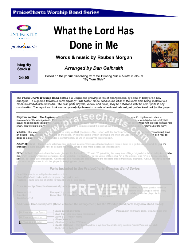 Download the Orchestration for What The Lord Has Done In Me by Hillsong Worship, from the album By Your Side. This song was arranged by Daniel Galbraith in the key of C, D.
