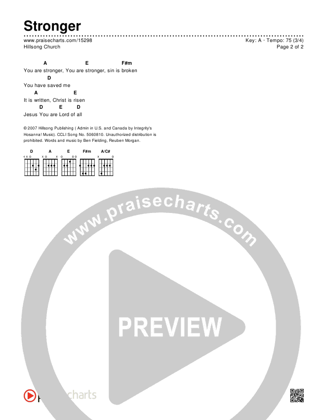 Download the PDF Chord Charts for Stronger by Hillsong Worship, from the album Yahweh. This song was arranged by Hillsong Music in the key of A.