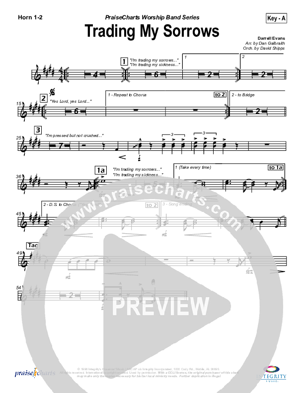 Download the French Horn sheet music for Trading My Sorrows by Darrell Evans, from the album Freedom. This song was arranged by Daniel Galbraith / David Shipps in the key of A, G.