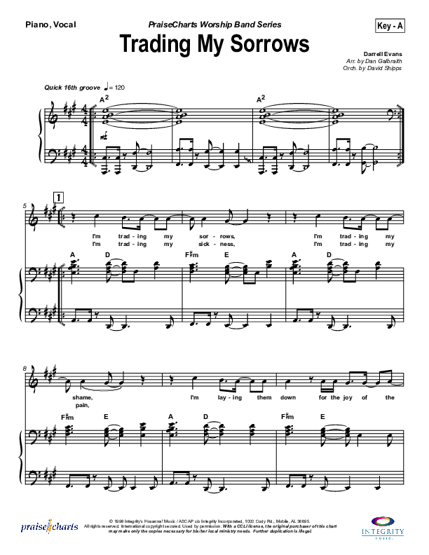 Download the sheet music for Trading My Sorrows by Darrell Evans, from the album Freedom. This song was arranged by Daniel Galbraith / David Shipps in the key of A, G.