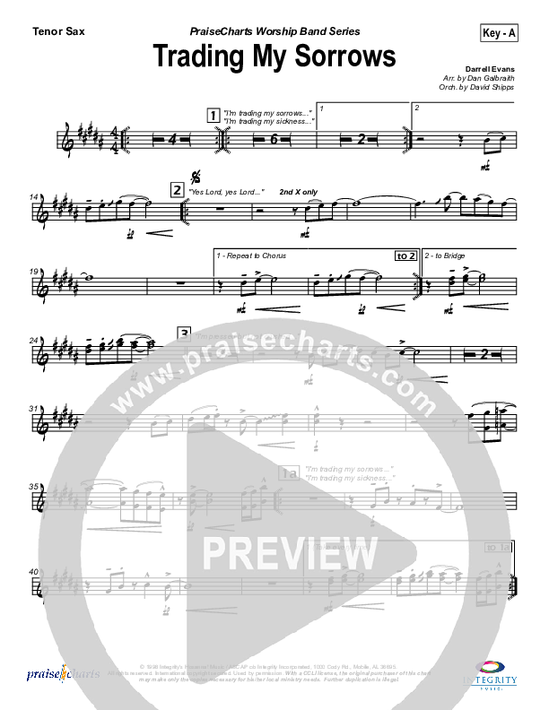 Download the Orchestration for Trading My Sorrows by Darrell Evans, from the album Freedom. This song was arranged by Daniel Galbraith / David Shipps in the key of A, G.