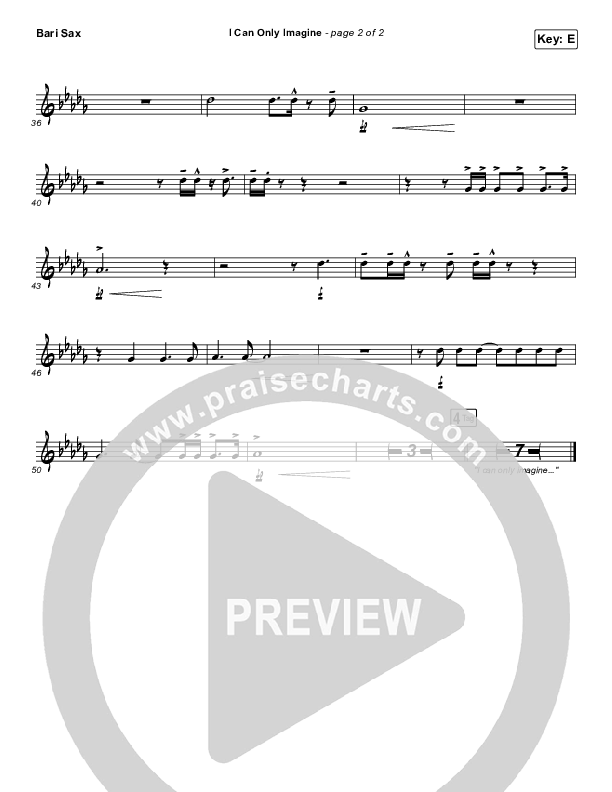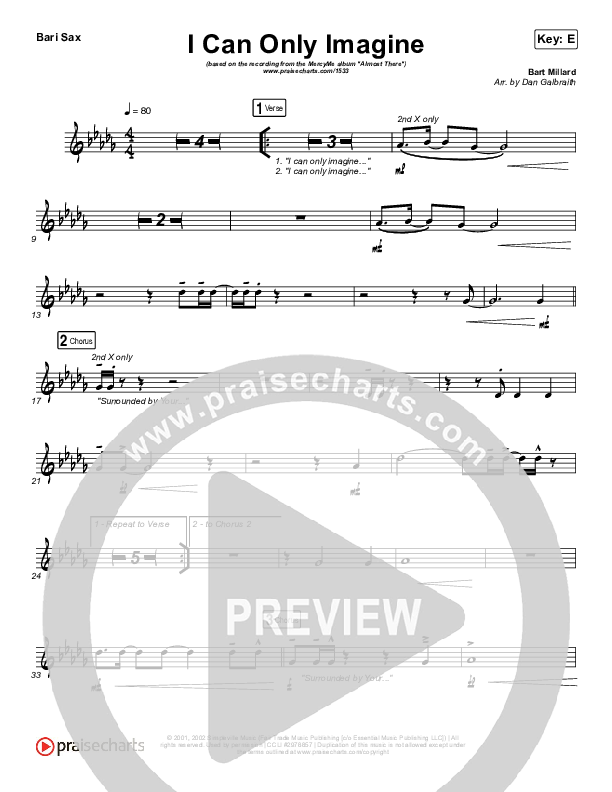 Download the Bari Sax sheet music for I Can Only Imagine by MercyMe, from the album Almost There. This song was arranged by Daniel Galbraith in the key of D, E, Eb.