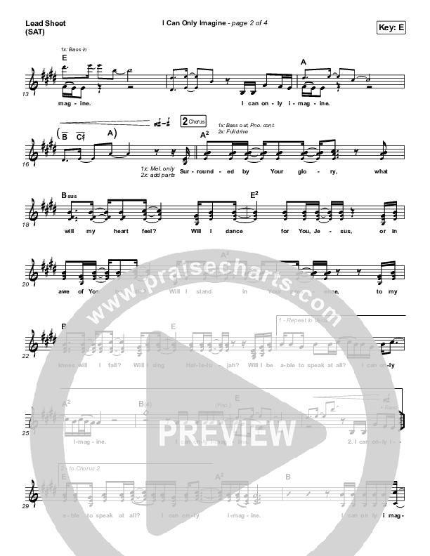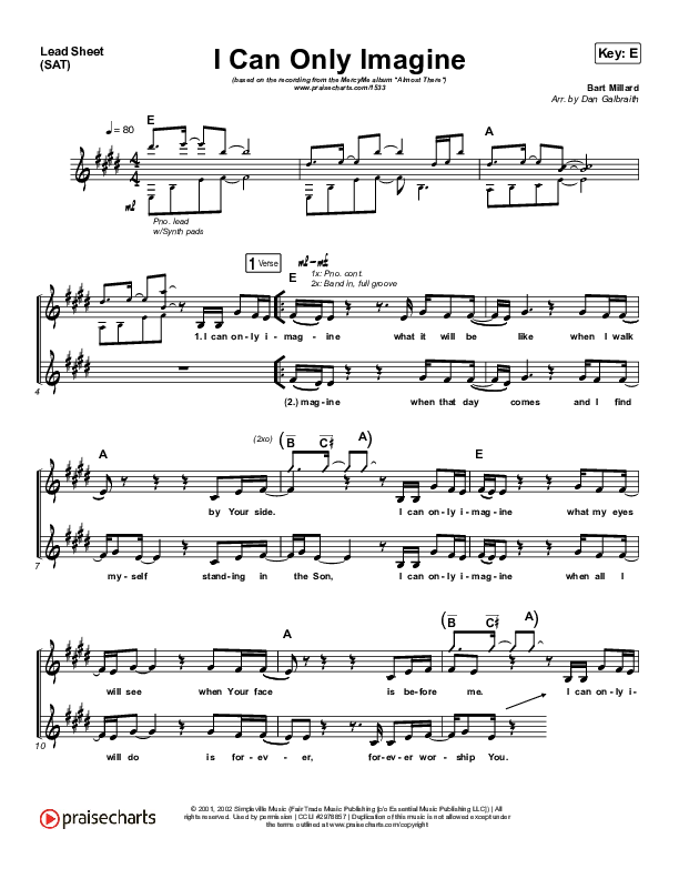 Download the sheet music for I Can Only Imagine by MercyMe, from the album Almost There. This song was arranged by Daniel Galbraith in the key of D, E, Eb.