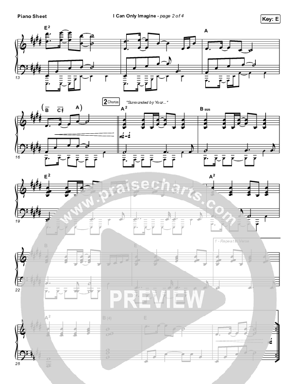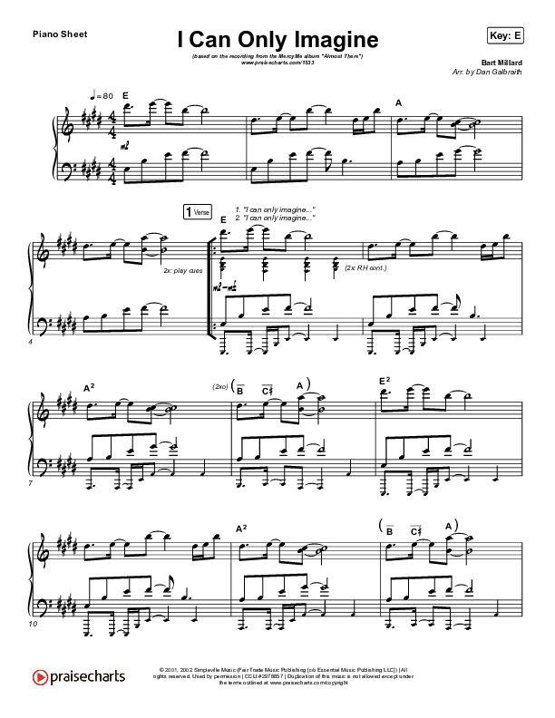Download the piano sheet for I Can Only Imagine by MercyMe, from the album Almost There. This song was arranged by Daniel Galbraith in the key of D, E, Eb.