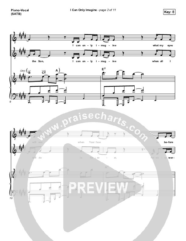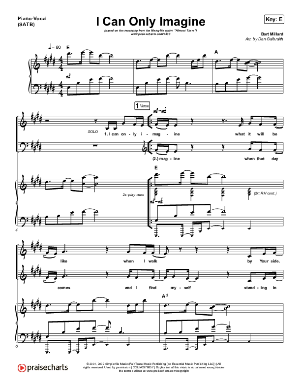 Download the sheet music for I Can Only Imagine by MercyMe, from the album Almost There. This song was arranged by Daniel Galbraith in the key of D, E, Eb.