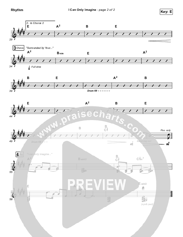 Download the Rhythm Chart for I Can Only Imagine by MercyMe, from the album Almost There. This song was arranged by Daniel Galbraith in the key of D, E, Eb.