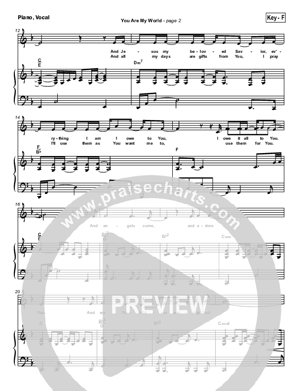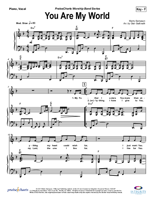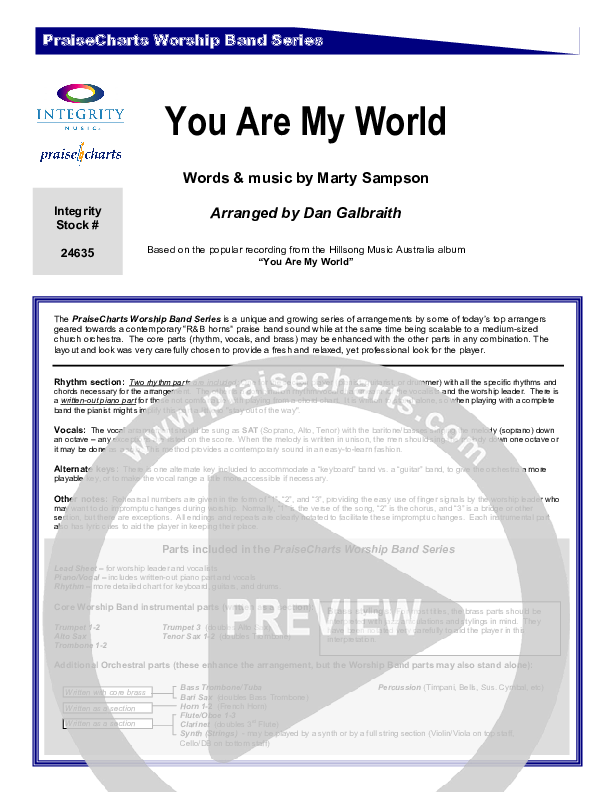 Download the Orchestration for You Are My World by Hillsong Worship, from the album You Are My World. This song was arranged by Daniel Galbraith in the key of F, G.