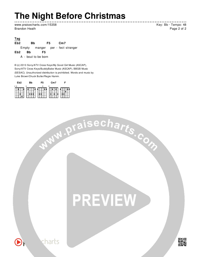 Download the PDF Chord Charts for The Night Before Christmas by Brandon Heath, from the album The Night Before Christmas. This song was arranged by John Wasson / Lee Marcum in the key of A, Bb.