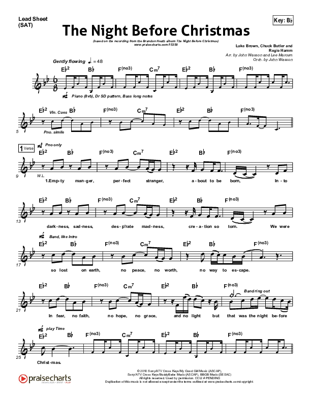 Download the Orchestration for The Night Before Christmas by Brandon Heath, from the album The Night Before Christmas. This song was arranged by John Wasson / Lee Marcum in the key of A, Bb.