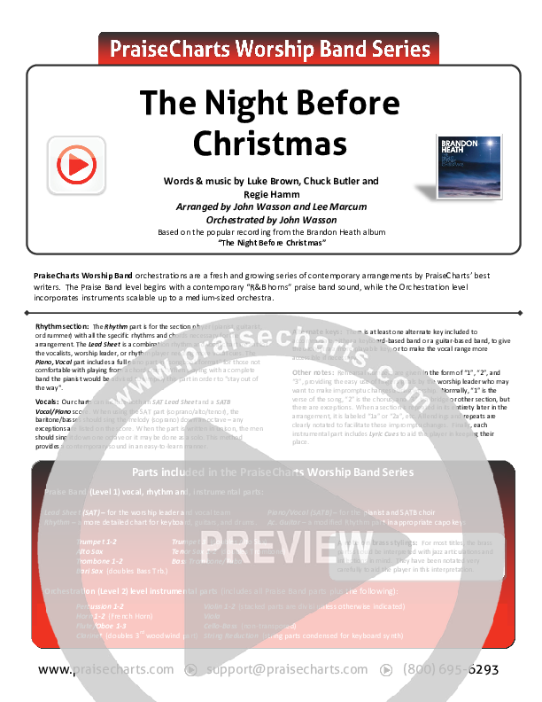 Download the Orchestration for The Night Before Christmas by Brandon Heath, from the album The Night Before Christmas. This song was arranged by John Wasson / Lee Marcum in the key of A, Bb.