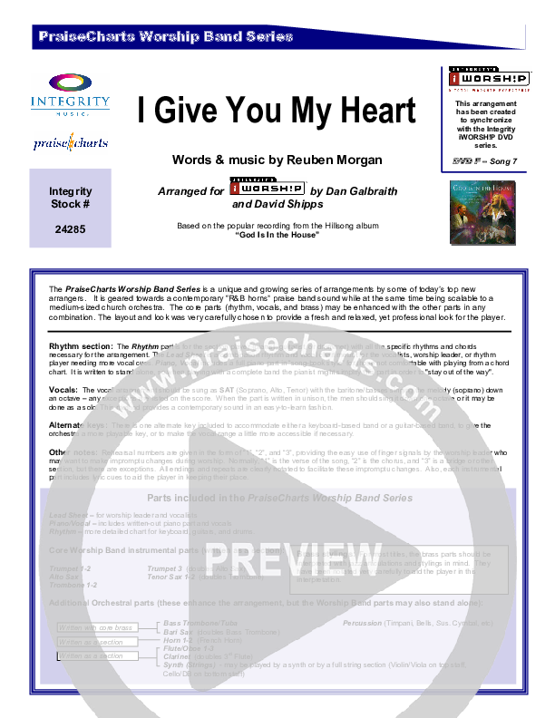 Download the Orchestration for I Give You My Heart by Hillsong Worship, from the album WOW Worship Yellow. This song was arranged by David Shipps in the key of E, G.