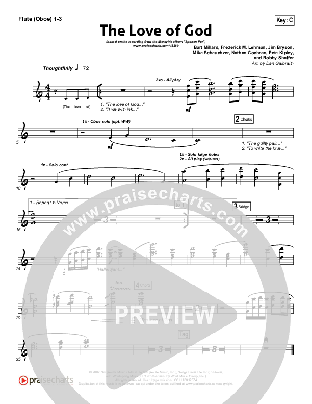 Download the Flute/Oboe sheet music for The Love Of God by MercyMe, from the album Spoken For. This song was arranged by Daniel Galbraith in the key of C, D.