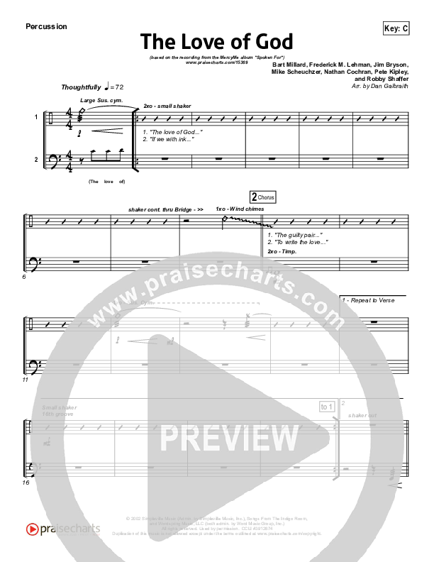 Download the percussion sheet music for The Love Of God by MercyMe, from the album Spoken For. This song was arranged by Daniel Galbraith in the key of C, D.