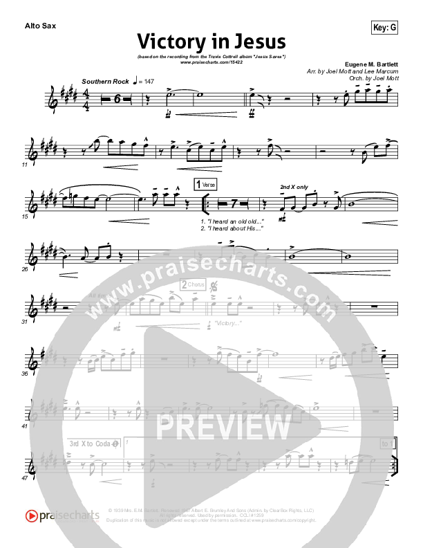 Download the AltoSax sheet music for Victory In Jesus by Travis Cottrell, from the album Jesus Saves Live. This song was arranged by Joel Mott / Lee Marcum in the key of F, G.