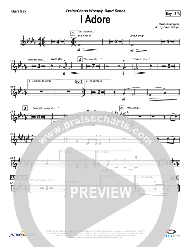 Download the Bari Sax sheet music for I Adore by Hillsong Worship, from the album Blessed. This song was arranged by Daniel Galbraith / David Shipps in the key of E, F.