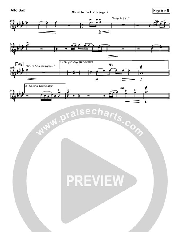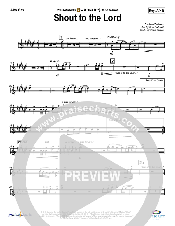 Download the AltoSax sheet music for Shout To The Lord by Hillsong Worship, from the album Shout To The Lord. This song was arranged by Daniel Galbraith / David Shipps in the key of A, Bb.