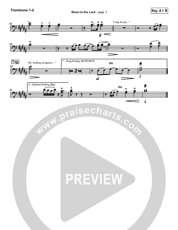 Download the Trombone 1,2 sheet music for Shout To The Lord by Hillsong Worship, from the album Shout To The Lord. This song was arranged by Daniel Galbraith / David Shipps in the key of A, Bb.